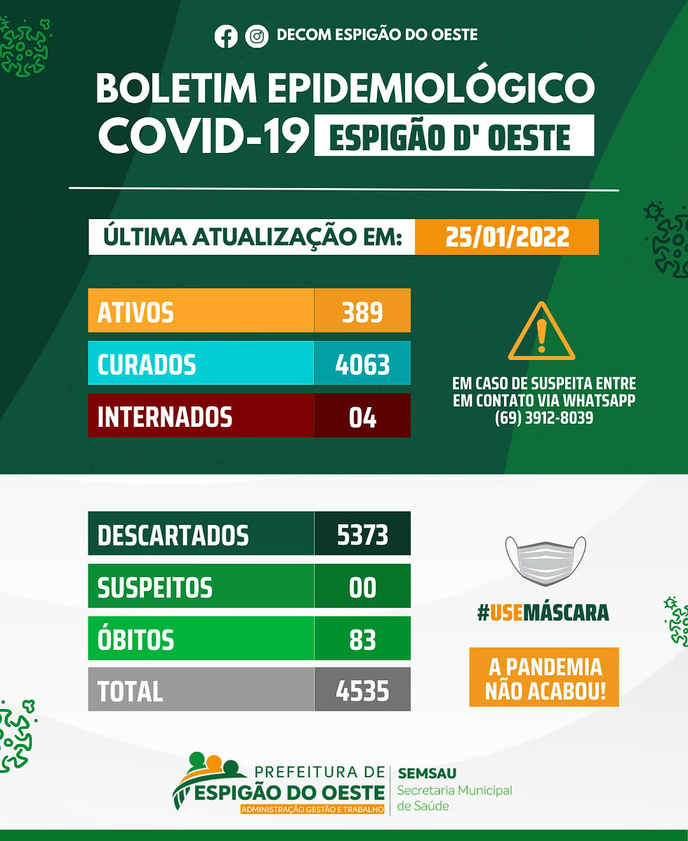 25 DE JANEIRO DE 2022 – BOLETIM DIÁRIO COVID-19 EM ESPIGÃO DO OESTE