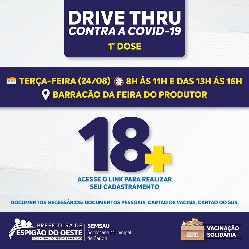 Sexta-feira (27/08), no Barracão da Feira do Produtor, das 08h ás 13h será ADIANTADA a aplicação da 2° Dose das Vacinas Pfizer e AstraZeneca para os seguintes dias de vencimento: